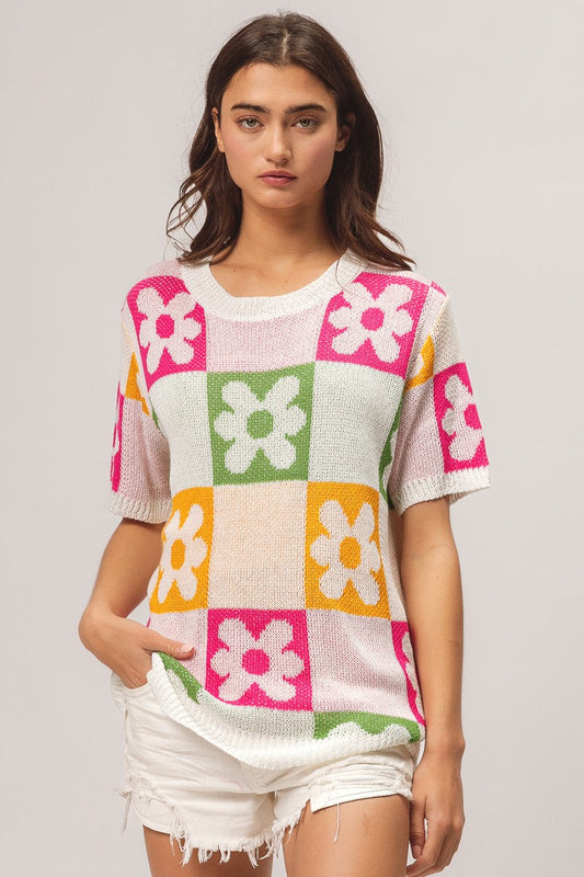 BiBi Flower Checker Pattern Short Sleeve Sweater