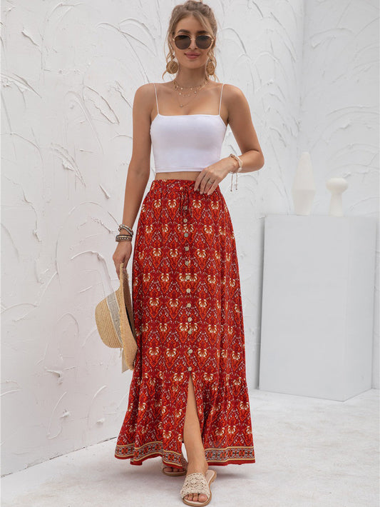 Boho Floral Print Tiered Buttoned Maxi Skirt