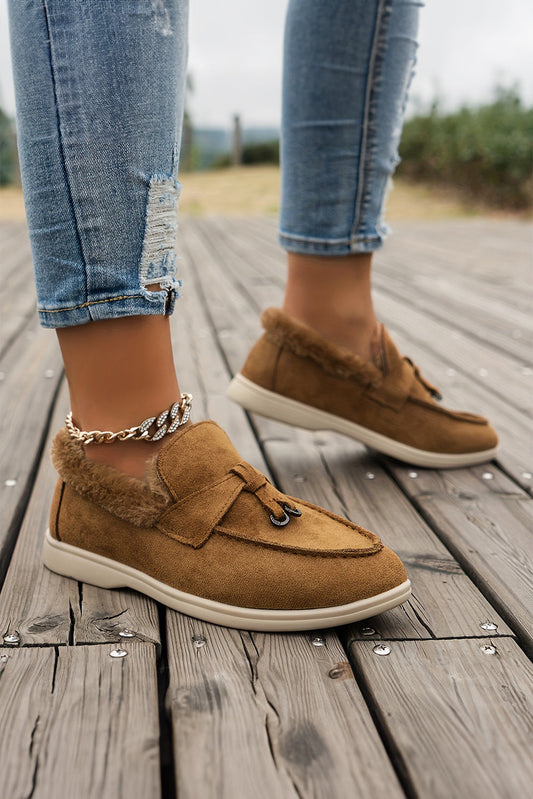 Camel Suede Fuzzy Winter Warm Platform Slippers